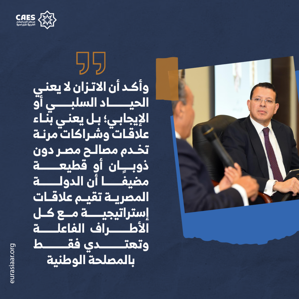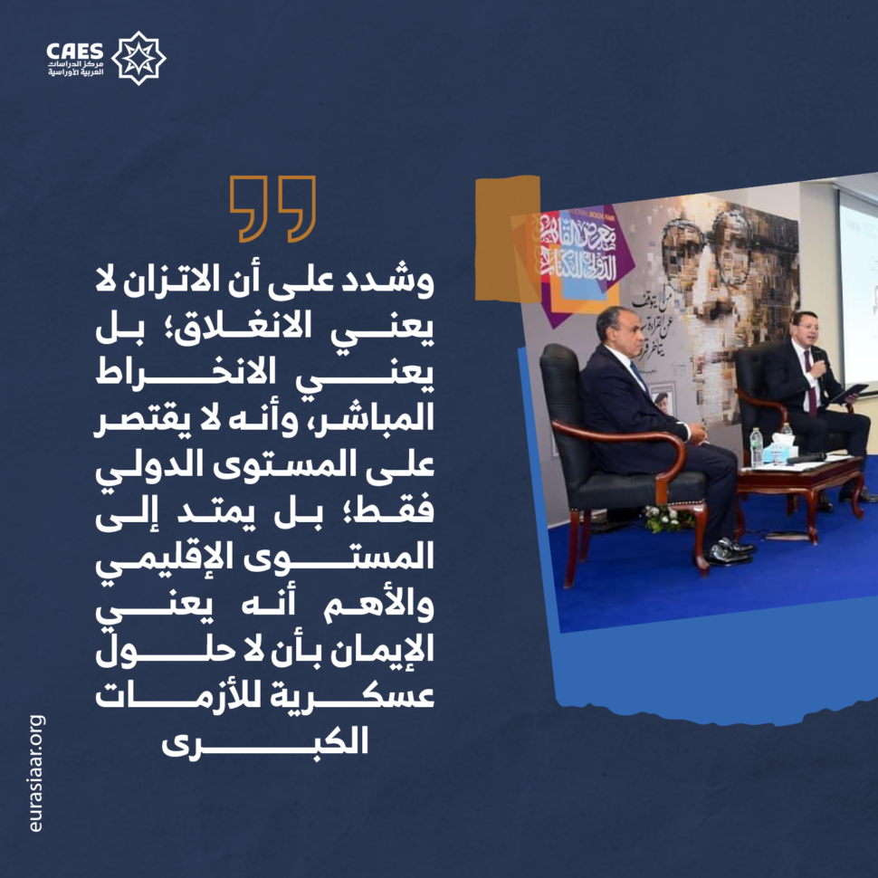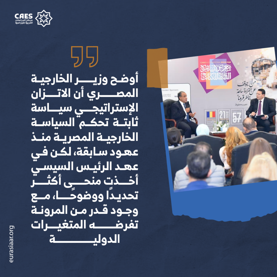 وزير الخارجية المصري: الاتزان الإستراتيجي عقيدة مصرية.. والسلام مع إسرائيل إطار قانوني.. ورفض تهجير الفلسطينيين أنقذ القضية حلّ الدكتور بدر عبد العاطي، وزير الخارجية والهجرة وشؤون المصريين بالخارج، ضيفًا على معرض القاهرة الدولي للكتاب في دورته الـ57، ضمن الفعاليات الثقافية المصاحبة للمعرض، لمناقشة كتاب "الاتزان الإستراتيجي.. ملامح من السياسة الخارجية…
