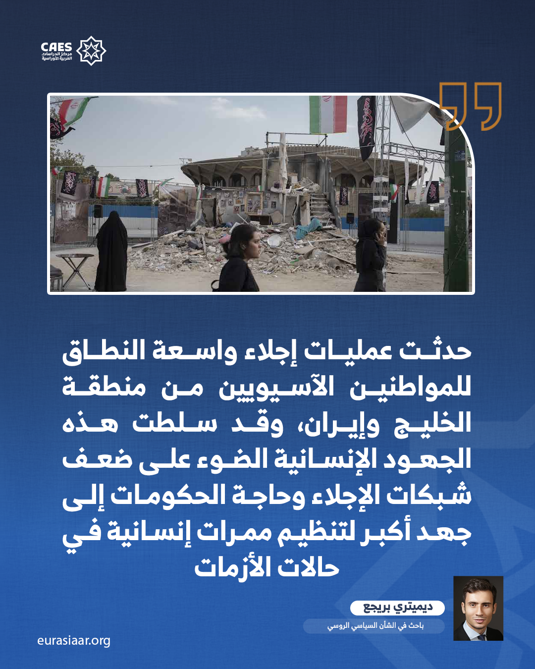 وأطلقت أوزبكستان عمليات مماثلة عبر الحدود التركمانية والإيرانية، فيما عبر مئات المواطنين من طاجيكستان وأذربيجان الحدود الإيرانية إلى أذربيجان عبر معبر أستارا. وقد سلطت هذه الجهود الإنسانية الضوء على ضعف شبكات الإجلاء وحاجة الحكومات إلى تعاون أكبر فيما بينها ومع الدول المضيفة لتنظيم ممرات إنسانية في حالات الأزمات.