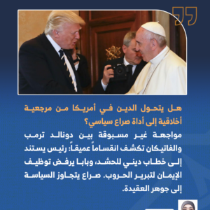 وعلى ما يبدو، وسط هذه المتغيرات الجيوسياسية، فإن هذا الصدام تعبير عن تحول عميق في طريقة توظيف الدين في السياسة الأمريكية. فطوال تاريخها، حرصت الولايات المتحدة على الفصل المبدئي بين سلطة الكنيسة وسلطة الدولة، وإن ظلت الحدود بينهما مرنة وقابلة للتفاوض. أما اليوم فقد بلغ الوضع درجة الخطر، إذ يستمد رئيس شرعيته من خطاب ديني يرى فيه مفتاح الحشد والنصر، بينما يرفض في الوقت ذاته أن تنتقده أعلى مرجعية دينية في العالم المسيحي.