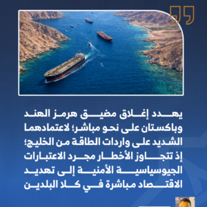 أخيرًا، أدت الحرب الحالية بين الولايات المتحدة وإسرائيل وإيران إلى تحويل مضيق هرمز من مجرد نقطة اختناق إلى عامل خطر فعلي ذي تأثيرات ملموسة على السوق في جنوب آسيا. وفي سيناريو إغلاق كامل لمضيق هرمز، سيُعد “كارثة عالمية”، حيث سيُزال (20) مليون برميل يوميًّا من الأسواق، مما يدفع الأسعار إلى (150-200) دولار، ويؤدي إلى ركود اقتصادي عالمي، مع تأثير أكبر على آسيا، حيث يذهب (84%) من النفط عبر هرمز إلى أسواقها. ولو هوجمت منشآت نفطية عربية في السعودية أو الإمارات والبلدان الخليجية الأخرى، سيضاعف هذا الخسائر الآسيوية، وبالنسبة للهند وباكستان، ستكون الهند أكثر تضررًا بسبب حجم استهلاكها، لكن باكستان قد تواجه أزمة أسرع بسبب ضعف احتياطياتها، وصعوبة إيجاد البدائل المناسبة.