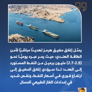 يمثل إغلاق مضيق هرمز تهديدًا مباشرًا لأمن الطاقة الهندي، حيث يمر عبره يوميًّا نحو (2.5-2.7) مليون برميل من النفط المستورد إلى الهند؛ لذا سيؤدي إغلاق المضيق إلى ارتفاع فوري في أسعار النفط، حيث يضيف كل دولار زيادة في سعر البرميل نحو ملياري دولار إلى فاتورة الاستيراد السنوية الهندية؛ مما يزيد التضخم، ويضغط على الروبية مقابل الدولار.