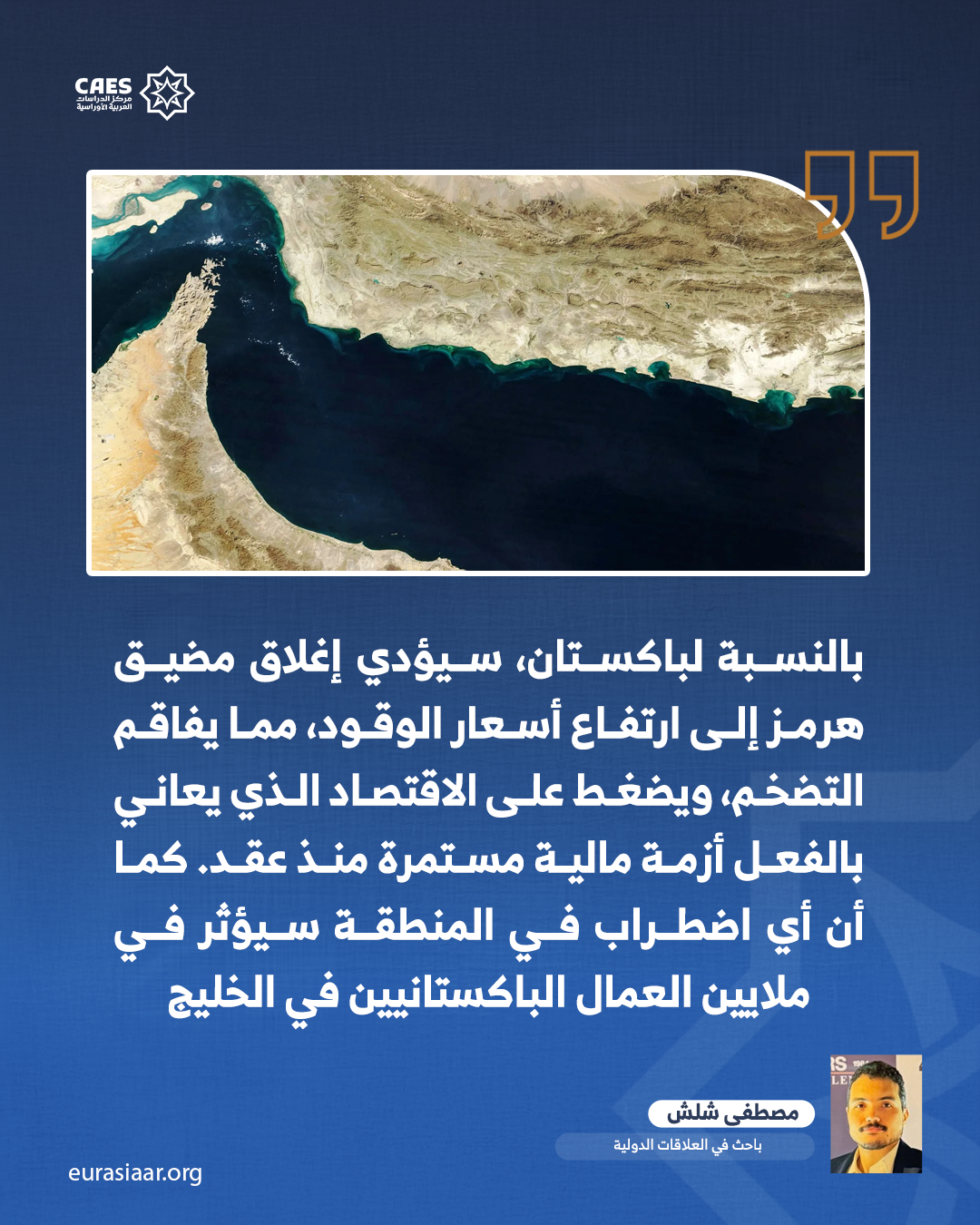 بالنسبة لباكستان، سيؤدي إغلاق مضيق هرمز إلى ارتفاع أسعار الوقود، مما يفاقم التضخم، ويضغط على الاقتصاد الذي يعاني بالفعل أزمة مالية مستمرة منذ عقد. كما أن باكستان تعتمد على التحويلات من الخليج، التي تشكل نصف إجمالي التحويلات، و(10%) من الناتج المحلي، وأي اضطراب في المنطقة قد يؤثر في ملايين العمال الباكستانيين هناك. وعلى عكس الهند، تفتقر باكستان إلى مخزونات إستراتيجية كبيرة، مما يجعلها أكثر عرضة للصدمات القصيرة الأمد. تحتفظ باكستان باحتياطيات نفطية تكفي لتغطية المخزون التجاري لمدة 20 يومًا تقريبًا، مقارنةً بـ 90 يومًا في دول منظمة التعاون الاقتصادي والتنمية.