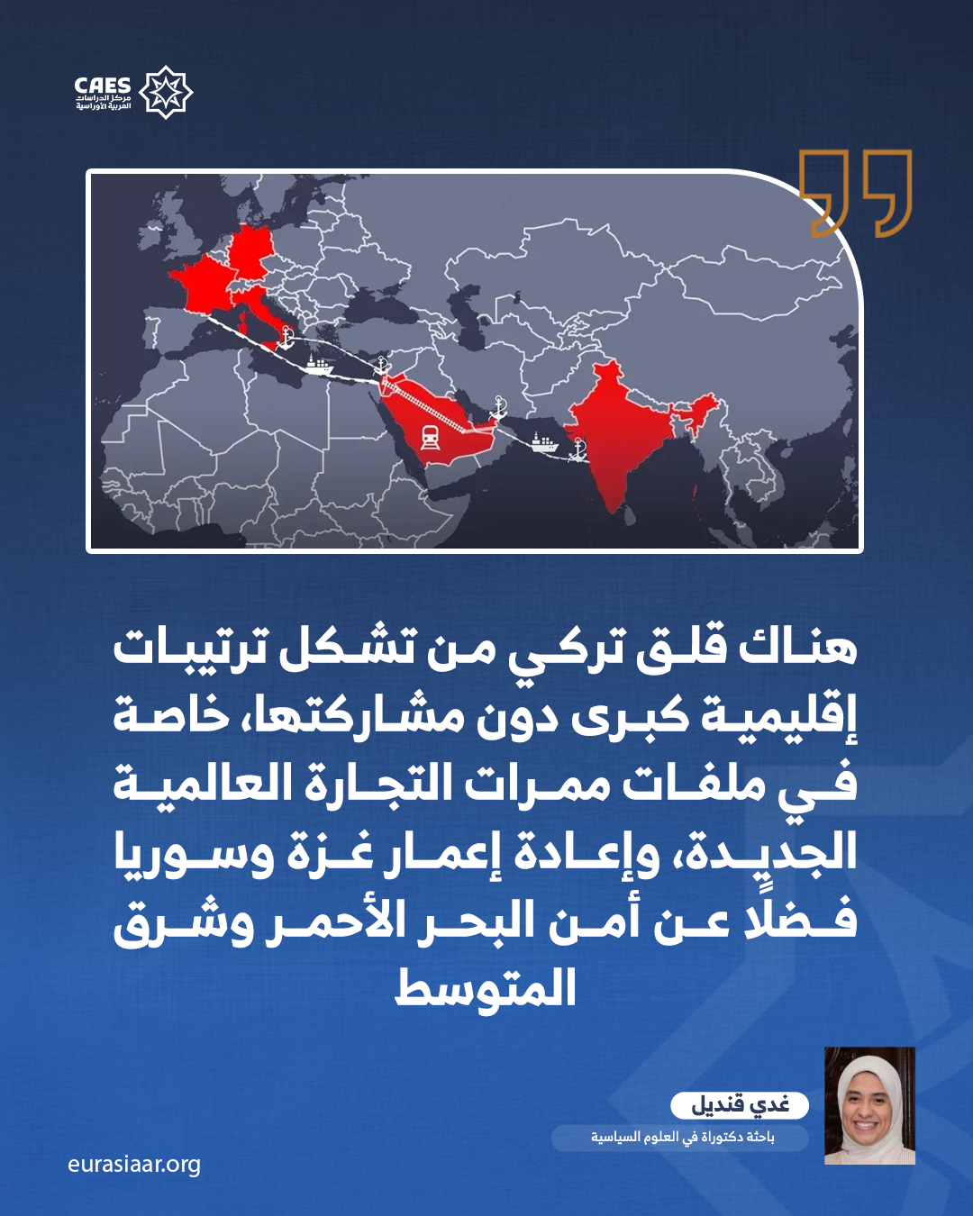 ولعل أحد المحركات الخفية للزيارة يتمثل في القلق التركي من تشكل ترتيبات إقليمية كبرى دون مشاركتها، خاصة في ملفات ممرات التجارة العالمية الجديدة، وإعادة إعمار غزة وسوريا، فضلًا عن أمن البحر الأحمر وشرق المتوسط، وشبكات الطاقة والبنية التحتية العابرة للحدود، ففي حال ترسخت هذه الترتيبات من خلال تفاهمات مصرية- سعودية- أمريكية- أوروبية، فإن تركيا ستجد نفسها أمام خسارة إستراتيجية مزدوجة؛ العزلة الجيوسياسية، وتراجع القيمة الوظيفية في حسابات القوى الكبرى؛ ما يجعل الزيارة التركية محاولة استباقية لكسر العزلة المحتملة، وليس مجرد تحسين صورة، أو ترميم علاقاتها مع العالم العربي.