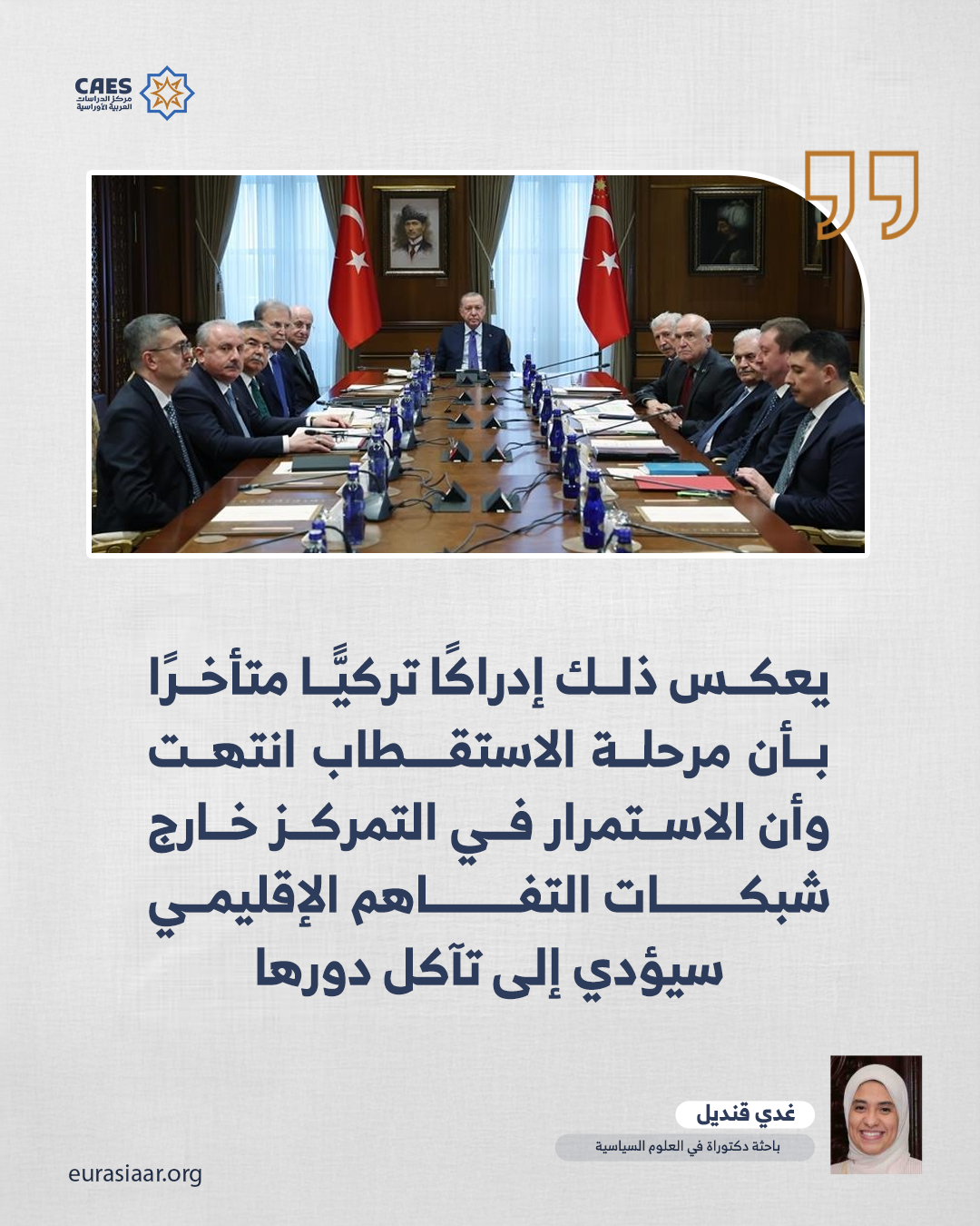 يمثل التحول الراهن في السياسة الخارجية التركية انعكاسًا لفهم دقيق لطبيعة النظام الدولي الراهن، حيث تتراجع فكرة القيادة الأحادية لصالح تعددية قطبية مرنة، وفي هذه البيئة، تزداد قيمة الدول القادرة على التحرك بين المحاور، وخلق مساحات تواصل بين قوى متنافسة؛ ومن ثم فإن تركيا تجد في الربط الإستراتيجي وسيلة لتعظيم نفوذها دون الانخراط في التزامات مكلفة قد تستنزف مواردها، والاقتراب من مصر والسعودية يمنحها عمقًا عربيًّا مؤسسيًّا، يعزز صورة أنقرة بوصفها فاعلًا قادرًا على الجمع بين دوائر متباينة بدل الاصطفاف في مواجهة إحداها.