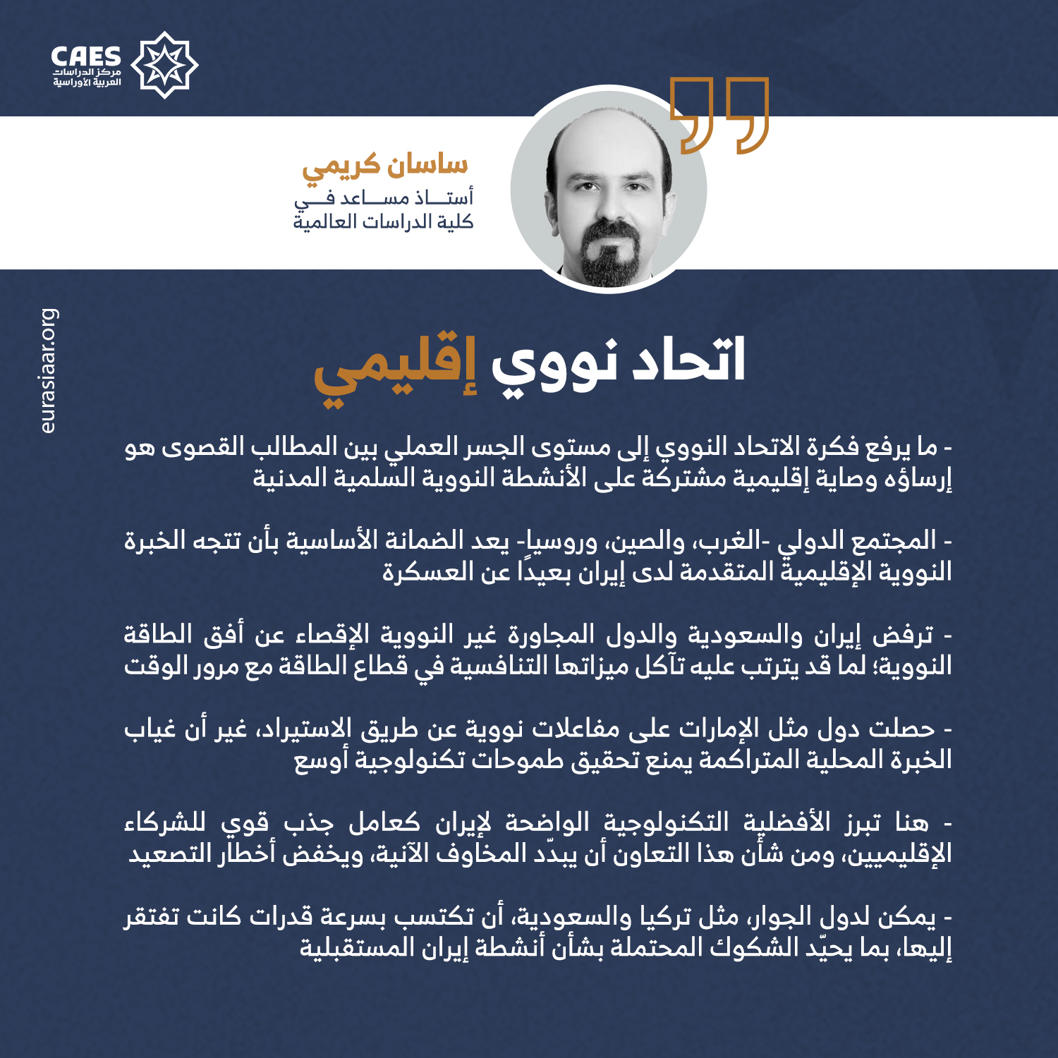 وما يرفع الاتحاد إلى مستوى الجسر العملي بين المطالب القصوى هو إرساؤه وصاية إقليمية مشتركة على الأنشطة النووية السلمية المدنية. ويشكّل ذلك، في الوقت نفسه، ردًّا غير مباشر على الغموض الذي يكتنف الترسانة النووية الكبيرة وغير المعلنة للنظام الإسرائيلي. أما المجتمع الدولي -الغرب، والصين، وروسيا على حد سواء- فتُعدّ الضمانة أساسية بأن تتجه الخبرة النووية الإقليمية المتقدمة لدى إيران بعيدًا عن العسكرة، بما يمنع سباق تسلح خطير في الخليج الفارسي وغرب آسيا على نطاق أوسع. وفي المقابل، ترفض إيران والسعودية والدول المجاورة غير النووية الإقصاء عن أفق الطاقة النووية، لما قد يترتب عليه تآكل ميزاتها التنافسية في قطاع الطاقة مع مرور الوقت. وتسعى هذه الدول إلى اندماج فعلي في مسارات المعرفة والتكنولوجيا والتنظيم والبحث والتطوير في هذا المجال، الذي يتجاوز البعد العسكري، كما تُظهر تجارب دول مثل اليابان، وكوريا الجنوبية، والأرجنتين.