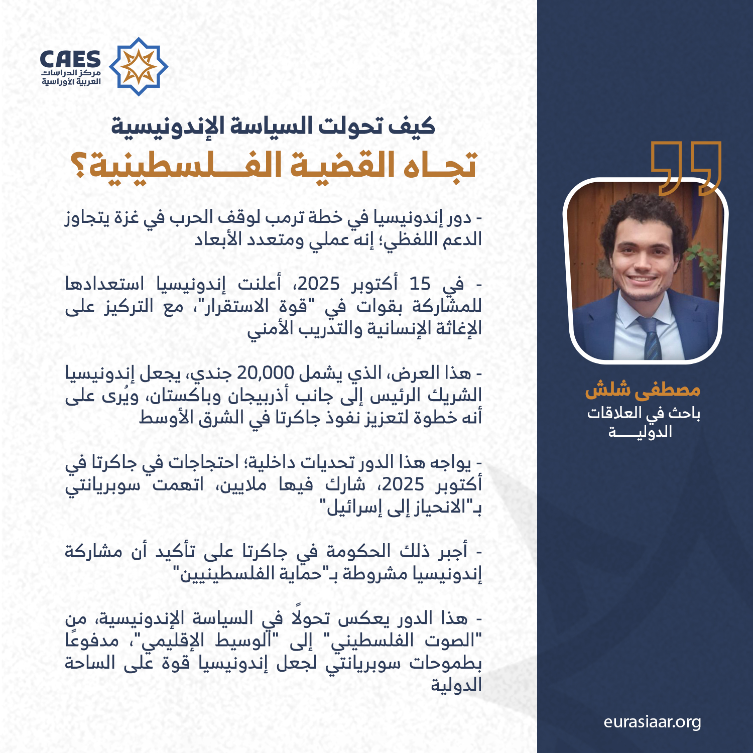 أدت إندونيسيا، بوصفها أكبر دولة إسلامية في العالم بعدد سكانها البالغ 280 مليون نسمة، دورًا مفاجئًا في خطة ترمب لإنهاء الحرب في غزة، التي أُعلنت في سبتمبر (أيلول) 2025 خلال قمة متعددة الأطراف في الأمم المتحدة، وهي ليست مجرد اقتراح لوقف إطلاق النار، بل هي رؤية شاملة لإعادة الإعمار والاستقرار تشمل إزالة حماس، وإطلاق سراح الرهائن، وتشكيل حكومة فلسطينية تكنوقراط. تحت قيادة الرئيس برابوو سوبريانتي، الذي تولى المنصب في أكتوبر (تشرين الأول) 2024، أعلنت جاكرتا استعدادها لتقديم قوات تصل إلى 20,000 جندي لقوة الاستقرار في غزة، مما يجعلها الدولة الوحيدة التي أعلنت عرضًا علنيًّا بهذا الحجم.