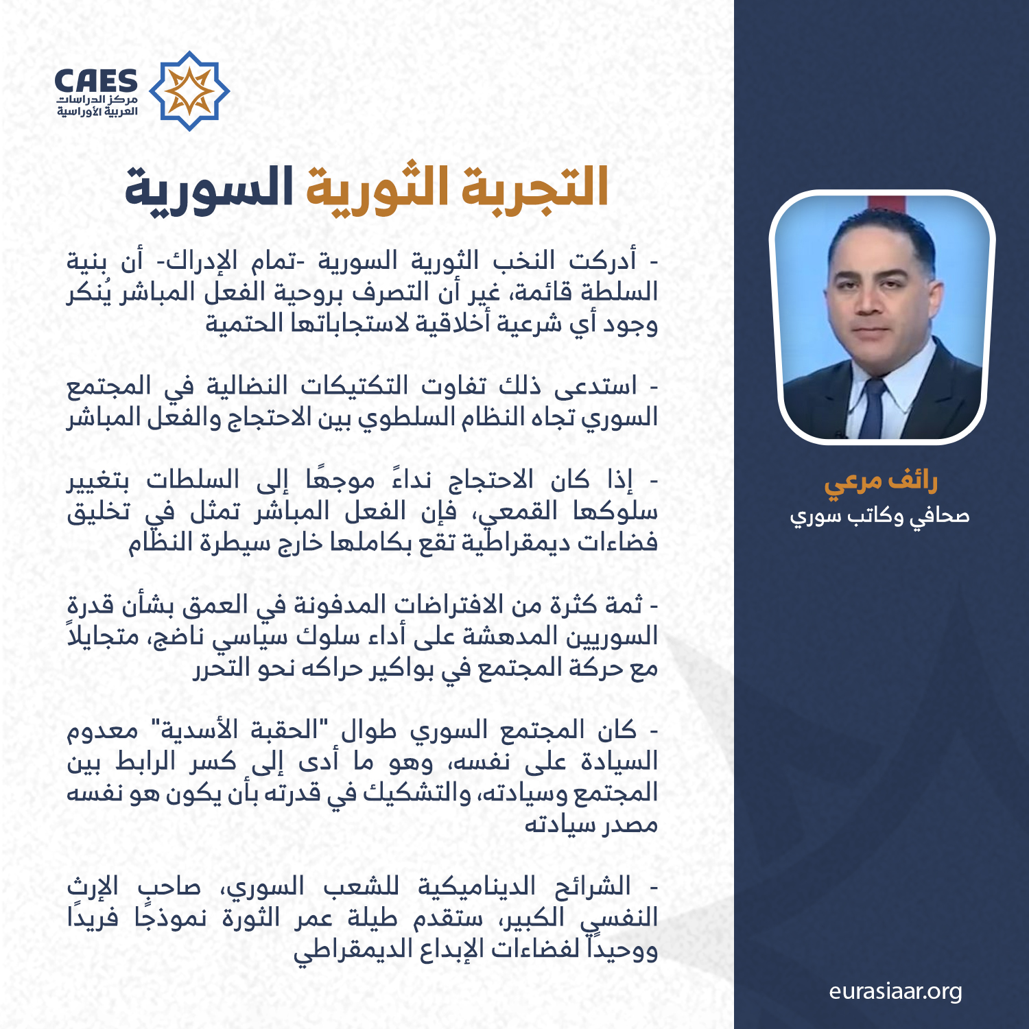 شمل التمرد السوري بوجه الاستبداد البعثي كل أصناف البشر من “نقابيين ماركسيين إلى لاهوتيين محافظين…”، لكن بقي أن جوهر هذا التمرد مطلب ليبرالي كلاسيكي بجمهورية دستورية علمانية تسمح بانتخابات حرة، واحترام حقوق الإنسان. ولما كان المجتمع السوري الطموح إلى الحرية محرومًا من الآلية، فإنه يستحيل وضع دليل توجيهي للهبات الجماهيرية، كنسخة معاصرة من تجارب سالفة، وإن كانت هناك قاعدة واحدة صالحة لكل مقاومة مدنية، فهي أنه لا توجد قواعد راسخة.