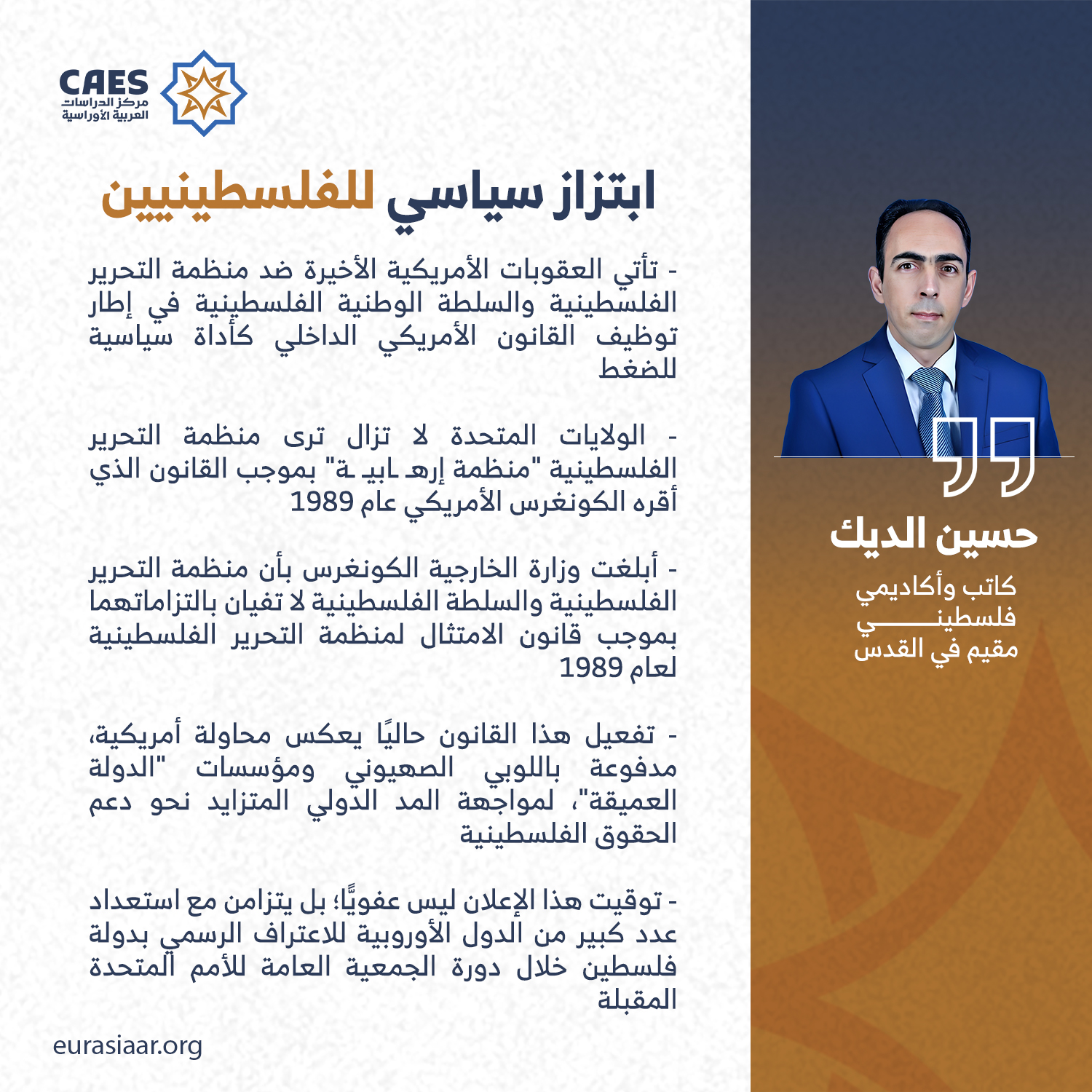 إن توقيت هذا الإعلان ليس عفويًّا؛ بل يتزامن مع استعداد عدد كبير من الدول الأوروبية للاعتراف الرسمي بدولة فلسطين خلال دورة الجمعية العامة للأمم المتحدة المقبلة في سبتمبر (أيلول) في نيويورك، وتفرض الولايات المتحدة عقوبات، منها رفض منح التأشيرات، على أعضاء منظمة التحرير الفلسطينية، وكبار المسؤولين في السلطة الفلسطينية، وفقًا للمادة 604 (أ) (١) من قانون (MEPCA).
