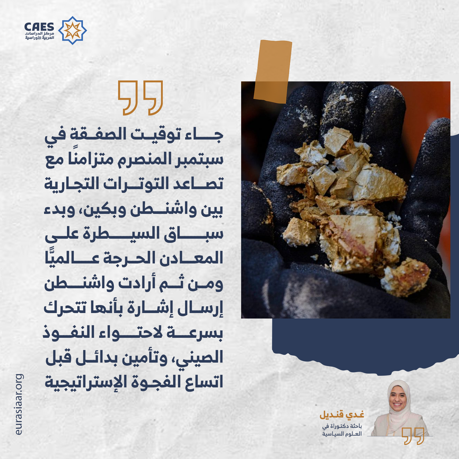 في السنوات الأخيرة، تصاعد الجدل بشأن المعادن الحرجة بوصفها ساحة جديدة للتنافس بين القوى الكبرى، حيث باتت العناصر النادرة أساسًا للصناعات التكنولوجية والعسكرية الحديثة، من بطاريات السيارات الكهربائية إلى الأقمار الصناعية وأنظمة الدفاع الذكية. وفي ظل هذا المشهد الدقيق، تمثل الصفقة الأمريكية مع باكستان في قطاع المعادن الحرجة المبرمة في سبتمبر (أيلول) المنصرم بنحو 500 مليون دولار، مؤشرًا على ملامح سياسة أمريكية جديدة لإعادة هندسة سلاسل الإمداد العالمية للموارد الحيوية، تقوم على توظيف دول نامية ذات مواقع جيولوجية إستراتيجية، مثل الكونغو الديمقراطية وزامبيا وأستراليا وغرينلاند وأوكرانيا وتركيا؛ لبناء شبكة بديلة تقلل من الاعتماد على الصين، فالرئيس الأمريكي دونالد ترمب يسعى منذ وصوله إلى البيت الأبيض في يناير (كانون الأول) الماضي إلى تحويل ملف الموارد إلى أداة نفوذ جيواقتصادي تمزج بين الاستثمارات التكنولوجية والمساعدات التنموية والتحالفات السياسية، ما يثير سلسلة من الأسئلة الجوهرية، لعل من أبرزها: هل تسعى واشنطن إلى بناء تحالف معدني عالمي لتقليص الاعتماد على الصين؟ وهل تمثل باكستان بموقعها الجيوسياسي وبنيتها الجيولوجية الغنية حلقة جديدة في إعادة تشكيل خريطة النفوذ الاقتصادي في جنوب آسيا؟ وما حدود التلاقي بين المصالح الأمريكية في تأمين الموارد الحيوية ومصالح باكستان في تحقيق التنمية والاستقرار الاقتصادي؟ ومن ثم تسعى هذه الدراسة إلى تحليل أبعاد الصفقة الأمريكية الباكستانية في قطاع المعادن الحرجة، من خلال تفكيك دوافعها الإستراتيجية، ودلالاتها الجيوسياسية، وانعكاساتها المحتملة على المستويات المحليـة والإقليمية والدولية، بما يسهم في فهم أعمق للتحول الجاري في بنية الاقتصاد الجيوسياسي العالمي.