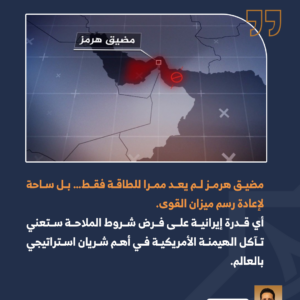 وبذلك أصبح هرمز رمزا لتحول ميزان القوى في الإقليم، تحول يتشكل أمام ناظرنا، وإذا تمكنت إيران من فرض شروط، ولو جزئية، على حركة الملاحة عبره، فإن ذلك سيشكل سابقة تضعف الهيمنة الأميركية، المبنية على وهم العظمة، في واحدة من أهم مناطق العالم استراتيجيا، وهذا ما تؤكده هذه الحرب يوما بعد يوم.