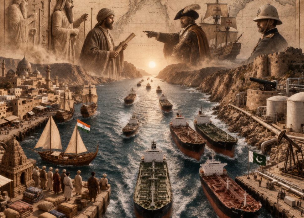 يُعد مضيق هرمز أحد أهم الممرات البحرية الاستراتيجية في العالم، إذ يربط بين الخليج العربي وبحر عُمان والمحيط الهندي، ويمتد عرضه بين 33 و95 كيلومترًا، وهو “حقل للدراسات التاريخية”، لاسيما في جنوب آسيا (خصوصًا الهند وباكستان). وقد كُتب عن المضيق بوصفه نقطة ربط تاريخي للثقافة والتجارة والأمن بين الخليج العربي وبحر عُمان والمحيط الهندي، وشملت هذه الجغرافيا تقلبات عدة منذ العصور الوسطى، مرورًا بالعصر البرتغالي والاستعمار البريطاني، وصولًا إلى عصر النفط. ويعود تاريخ المضيق إلى أكثر من 5000 عام، حيث استخدمته حضارات قديمة مثل السومرية والبابلية والفارسية الأخمينية والإغريقية والفينيقية كمعبر تجاري وحربي. ومرّت عبره طرق التجارة القديمة، وشهد مرور السومريين في الألف الثالث قبل الميلاد (كما تدل نقوش في عُمان)، وكان جزءًا من شبكة تجارة الحرير والتوابل.
