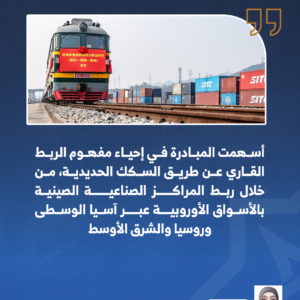 وفي هذا السياق، برزت شبكات النقل وطرق العبور الدولية بوصفها عنصرًا حاسمًا في ضمان استمرارية التدفقات التجارية، ويحتل الشرق الأوسط موقعًا محوريًّا ضمن هذه التحولات؛ نظرًا إلى خصائصه الجغرافية والاقتصادية، حيث يشكل حلقة وصل طبيعية بين الأسواق الآسيوية والأوروبية والإفريقية. وقد تزامن هذا الموقع مع تصاعد مبادرات دولية كبرى تهدف إلى إعادة هيكلة الترابط الاقتصادي بين الأقاليم، من خلال الاستثمار في مشروعات السكك الحديدية والربط البري. وهي مشروعات حديثة تعكس توجهًا متزايدًا لدى القوى الدولية نحو ترسيخ حضورها في مناطق العبور الإستراتيجية، وربط نفوذها الاقتصادي بالبنية التحتية طويلة الأمد.