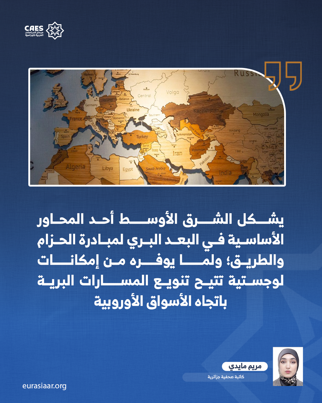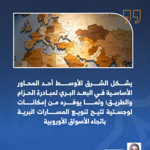 وفي هذا الإطار، يشكل الشرق الأوسط أحد المحاور الأساسية في البعد البري لمبادرة الحزام والطريق؛ لموقعه الجغرافي الذي يربط آسيا بأوروبا، ولما يوفره من إمكانات لوجستية تتيح تنويع المسارات البرية باتجاه الأسواق الأوروبية. وتبرز أهمية الإقليم في كونه حلقة وصل بين الممرات الآسيوية والفضاء المتوسطي؛ ما يجعل دوره مركزيًّا في الرؤية الصينية لإعادة تشكيل الجغرافيا الاقتصادية العالمية عبر الربط القاري.