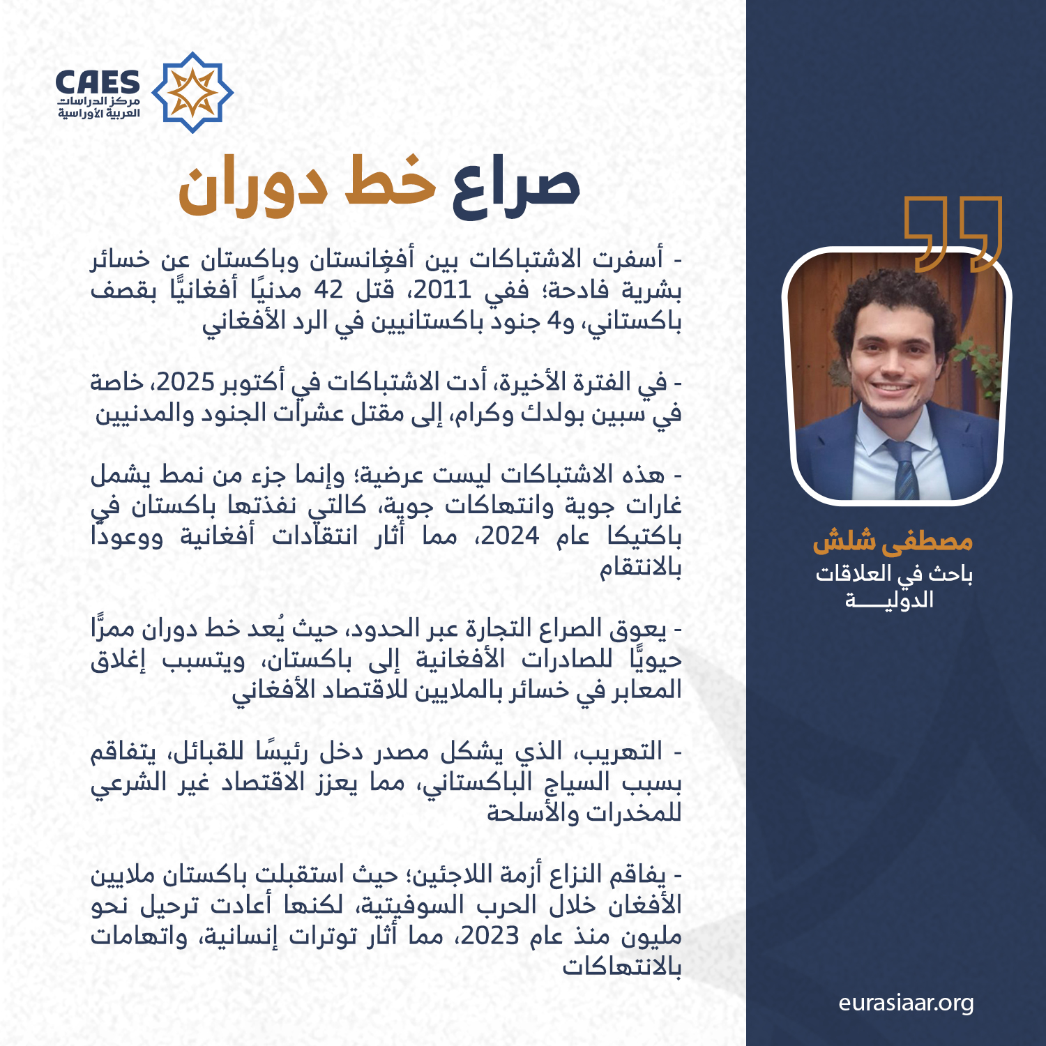 يُعد الصراع العسكري بين أفغانستان وباكستان واحدًا من أكثر النزاعات تعقيدًا في تاريخ جنوب آسيا، حيث تمتد جذوره إلى عصر الاستعمار البريطاني، ويستمر حتى اليوم بوصفه عاملًا رئيسًا في تشكيل الديناميكيات الأمنية الإقليمية. يركز هذا الصراع على خط دوران، الخط الحدودي الذي رسمته بريطانيا عام 1893 لفصل إمارة أفغانستان عن الهند البريطانية، والذي أصبح بعد استقلال باكستان عام 1947 حدًّا دوليًّا غير معترف به من جانب كابُل. هذا الخط، الذي يمتد إلى أكثر من 2600 كيلو متر، لا يقسم أراضي فحسب؛ بل يقسم شعوبًا وثقافات، خاصة قبائل البشتون التي تعيش على الجانبين، مما يجعله مصدرًا للتوترات العسكرية المتكررة والنزاعات الحدودية.