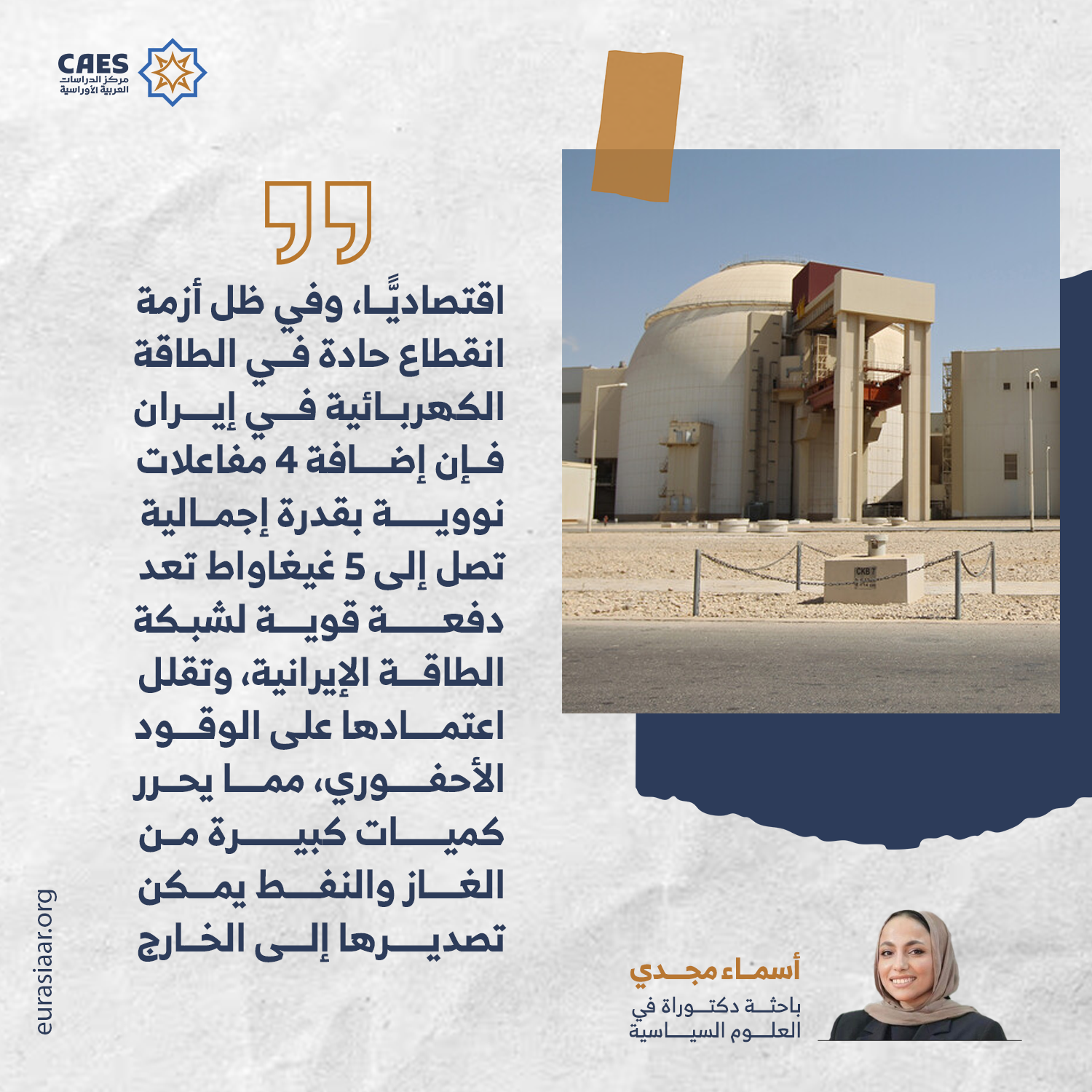 من الناحية الاقتصادية، وفي ظل أن إيران تعاني منذ سنوات أزمة انقطاع حادة في الطاقة الكهربائية، فإن إضافة أربعة مفاعلات نووية بقدرة إجمالية تصل إلى 5 غيغاواط تعد دفعة قوية لشبكة الطاقة الإيرانية، وتقلل اعتمادها على الوقود الأحفوري، مما يحرر كميات كبيرة من الغاز والنفط يمكن تصديرها إلى الخارج. كما أن هذا التعاون يتيح لإيران الاستفادة من التكنولوجيا النووية الحديثة، وتدريب كوادرها الوطنية؛ مما يعزز قدرتها في مجال تكنولوجيا الطاقة النووية لتوليد الكهرباء.