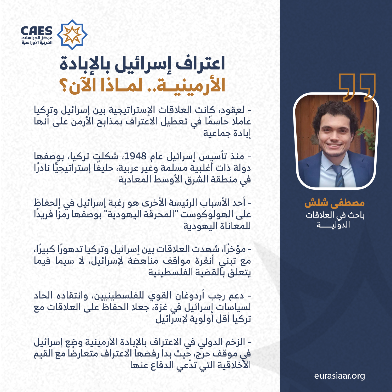 إن قرار إسرائيل الاعتراف بمذابح الأرمن على أنها إبادة جماعية، بعد عقود من التردد، يعكس تحولات عميقة في السياسة الخارجية الإسرائيلية، مدفوعة بتدهور العلاقات مع تركيا، والضغوط الدولية، والحاجة إلى تعزيز الصورة الأخلاقية. هذا الاعتراف يحمل دلالات رمزية وسياسية، حيث يعزز العلاقات مع أرمينيا وبعض الدول الأوروبية، لكنه قد يزيد التوتر مع تركيا. في النهاية، يظل هذا القرار مثالًا واضحًا على كيفية تشابك الأخلاقيات والجيوسياسية في اتخاذ القرارات السياسية؛ مما يعكس تعقيدات العلاقات الدولية في منطقة الشرق الأوسط.