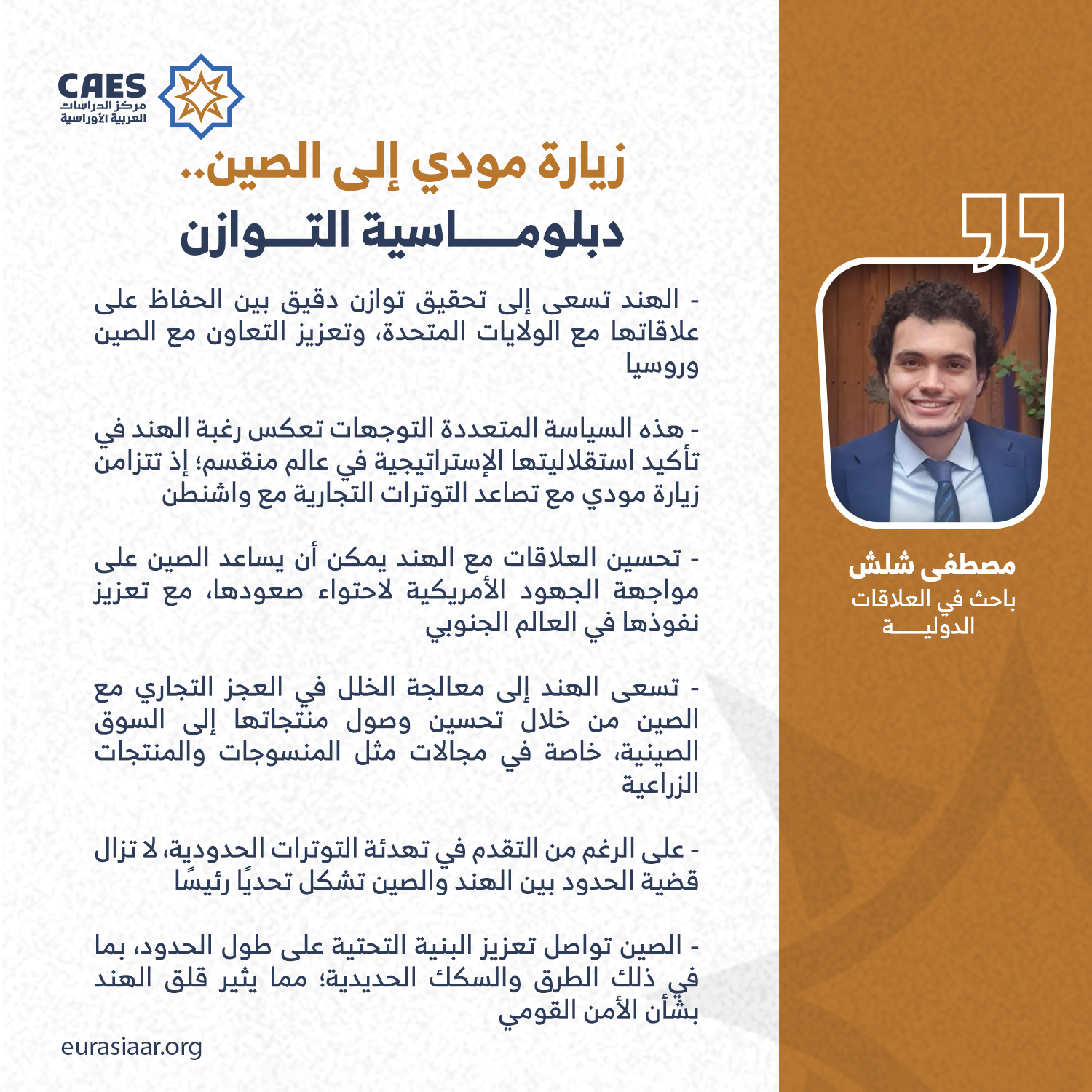 تُمثل زيارة مودي إلى الصين فرصة لإعادة ضبط العلاقات الثنائية في سياق عالمي متغير. الهند تسعى إلى تحقيق توازن دقيق بين الحفاظ على علاقاتها مع الولايات المتحدة، وتعزيز التعاون مع الصين وروسيا. هذه السياسة المتعددة التوجهات تعكس رغبة الهند في تأكيد استقلاليتها الإستراتيجية في عالم منقسم. من وجهة نظر الصين، فإن تحسين العلاقات مع الهند يمكن أن يساعد على مواجهة الجهود الأمريكية لاحتواء صعودها، مع تعزيز نفوذها في العالم الجنوبي. أما الهند، فإن التعاون مع الصين يوفر فرصًا اقتصادية وإقليمية، لكنه يتطلب إدارة دقيقة للتحديات الأمنية والسياسية.