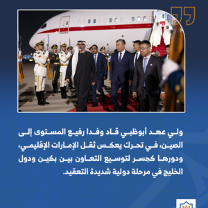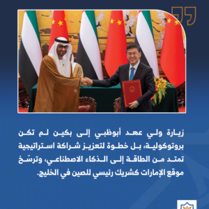 تعكس زيارة ولي عهد أبوظبي إلى الصين تحولا متقدما في مسار العلاقات الثنائية، يقوم على توسيع الشراكة الاقتصادية وتعميق التعاون الاستراتيجي، مع بروز دور الإمارات كفاعل إقليمي قادر على ربط المصالح الصينية بمنطقة الخليج، في وقت يتزايد فيه اهتمام بكين بتأمين مصالحها الاقتصادية وتعزيز حضورها في بيئة دولية وإقليمية معقدة.