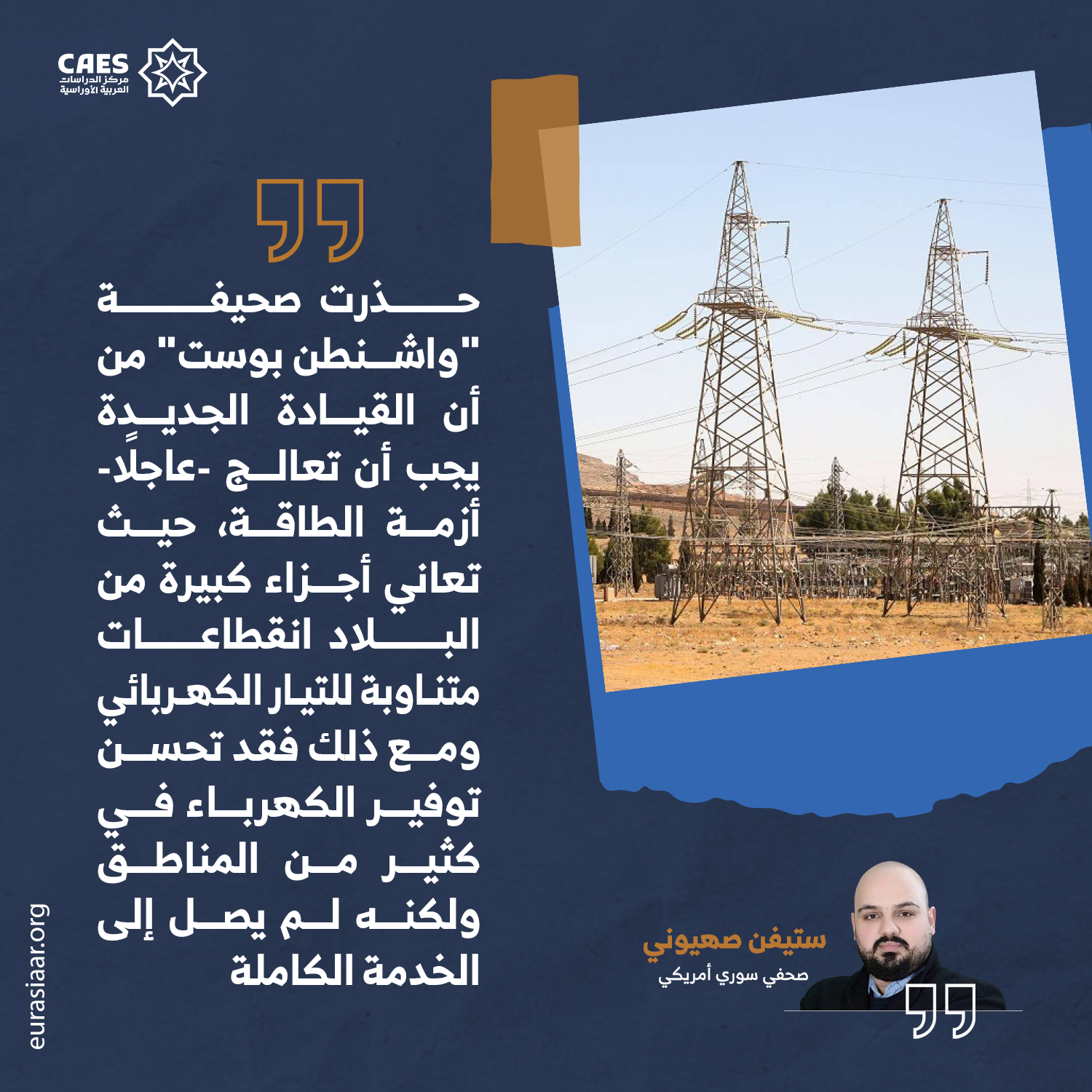 على الرغم من التقدم المتواضع، يظل 90% من السوريين تحت خط الفقر، مع حاجة 16.7 مليون شخص إلى مساعدة إنسانية. يقدر البنك الدولي تكاليف إعادة الإعمار بما يتراوح من 216 إلى 400 مليار دولار. وقد تقلص الناتج المحلي الإجمالي بنسبة 50- 65% منذ عام 2010. ومن المتوقع أن يبلغ النمو الاقتصادي لعام 2025، 1% فقط. حذرت صحيفة “الواشنطن بوست” من أن القيادة الجديدة يجب أن تعالج -عاجلًا- أزمة الطاقة، حيث تعاني أجزاء كبيرة من البلاد انقطاعات متناوبة للتيار الكهربائي، ومع ذلك فقد تحسن توفير الكهرباء في كثير من المناطق، ولكنه لم يصل إلى الخدمة الكاملة. ستتطلب المشروعات التجارية وإعادة الإعمار توفير مزيد من الكهرباء.