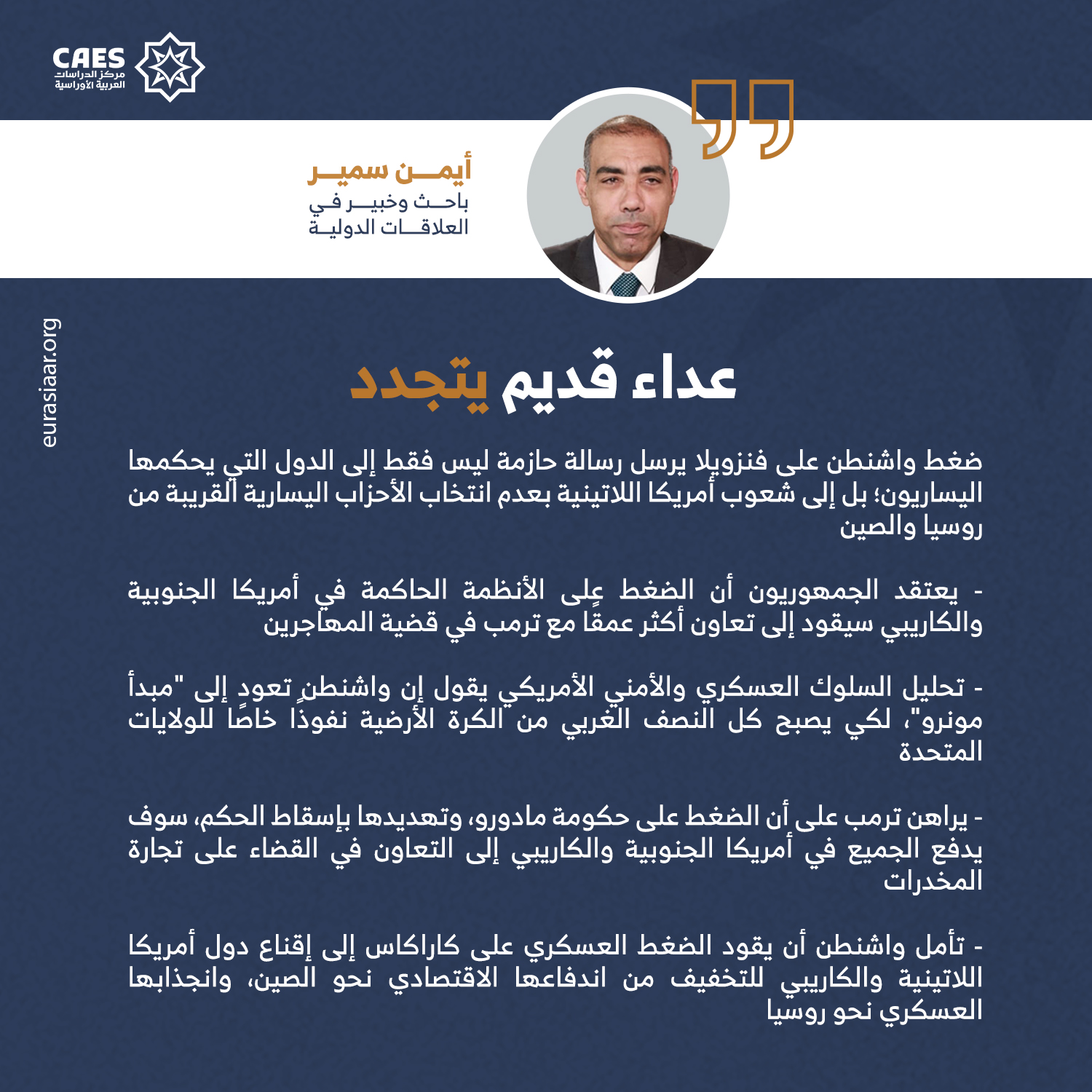 التهديدات الأمريكية لفنزويلا تعود إلى أسباب كثيرة، أبرزها أن ماركو روبيو، وزير الخارجية الأمريكية -الذي جاء والده إلى الولايات المتحدة هربًا من كوبا الشيوعية- يقود السياسة الخارجية الأمريكية نحو مزيد من التشدد تجاه الدول الاشتراكية في أمريكا الجنوبية، مثل كوبا، وفنزويلا، ونيكاراغوا، وبوليفيا، ولا تتزامن “عسكرة الخلافات” في الكاريبي فقط مع رفع الرئيس الأمريكي دونالد ترمب شعار “السلام القائم على القوة”، الذي تجسد في إجبار بنما على الانسحاب من مبادرة الحزام والطريق الصينية؛ بل مع الانزعاج الأمريكي الواضح من زيادة النفوذ والمقبولية الروسية والصينية في أمريكا اللاتينية، حيث يرى البيت الأبيض أن حماية الحدود الجنوبية للولايات المتحدة لا تبدأ من الحدود المكسيكية فقط؛ بل تمتد إلى كل بقعة وشبر في الكاريبي وأمريكا اللاتينية، وهو ما يقول إن فنزويلا تحولت -في نظر الأمريكيين- إلى “عقدة جيوسياسية ثلاثية الأبعاد”، تتمثل في خطر المخدرات، وزيادة النفوذ الروسي، والاختراق الاقتصادي الصيني، فهل نحن أمام حرب جديدة في أمريكا اللاتينية بعد نحو 36 عامًا من الغزو الأمريكي لبنما عام 1989، والإطاحة بحكم الرئيس مانويل نوريجا؟ وما خيارات حكومة الرئيس مادورو لمنع الغزو الأمريكي أو إسقاط النظام؟ وإلى أي مدى تسعى الولايات المتحدة إلى العودة مرة أخرى إلى “مبدأ مونرو”، والتخلص من أي حكومة اشتراكية يسارية في أمريكا الجنوبية في ظل العداء الشديد بين الرئيس ترمب واليساريين داخل الولايات المتحدة نفسها؟ وما علاقة “النفط الفنزويلي” بالصراع الجديد بين الرئيسين ترمب ومادورو؟