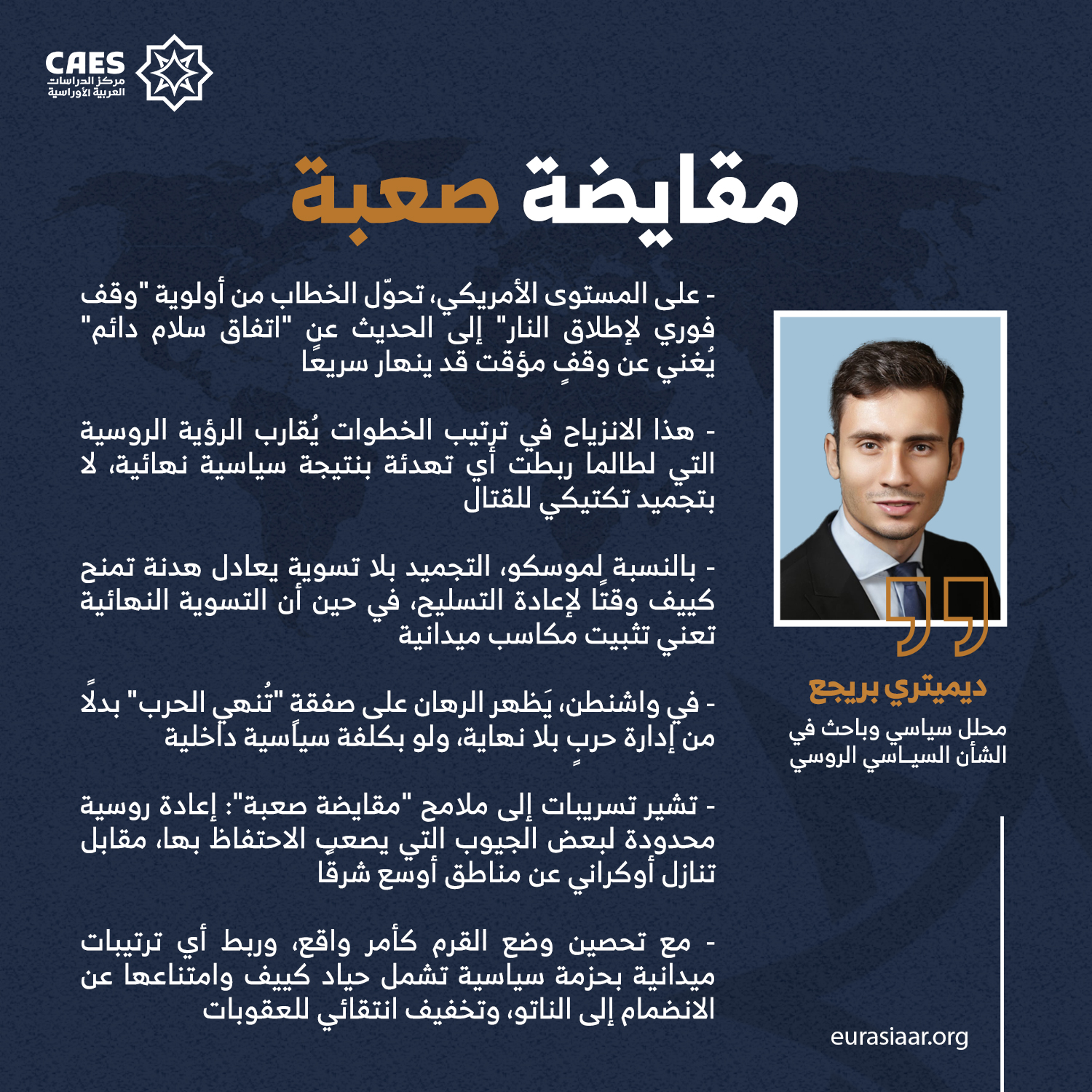 1) مسار صفقة تدريجية: تفاهم سياسي على الإطار العام (ضمانات- حدود- اقتصاد) يتزامن مع تهدئة ميدانية تتوسع خطوة بخطوة. هذا المسار يحتاج إلى قيادة أمريكية نشطة، ووحدة أوروبية، واستعدادًا أوكرانيًّا لتفضيل المكاسب الأمنية- الاقتصادية الفورية على مكاسب رمزية مؤجلة.