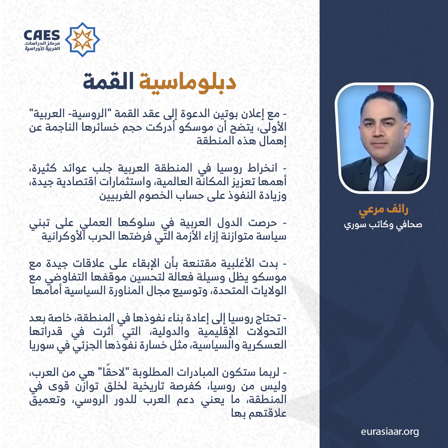 توازيًا، باتت النخبة الروسية تدرك أنها تأخرت في تبني “دبلوماسية القمة” مع الدول العربية، وقد سبقتها الصين في ثلاث قمم (سعودية- خليجية- عربية) في أكتوبر (تشرين الأول) ٢٠٢٢، فضلًا عن أن روسيا (نفسها) عقدت قمتين مع الدول الإفريقية (الأولى في سوتشي- ٢٠١٩، والثانية في سانت بطرسبورغ- ٢٠٢٣).