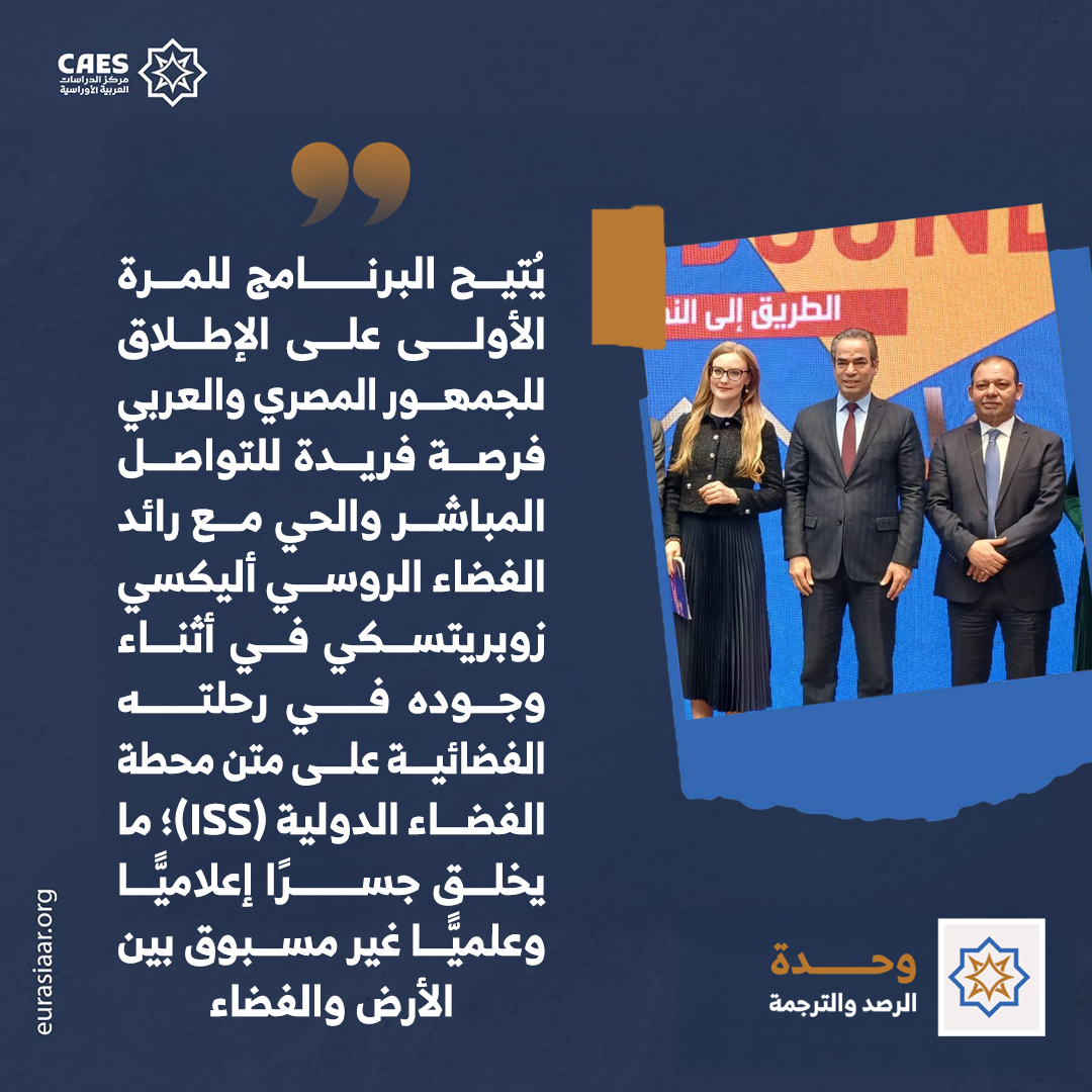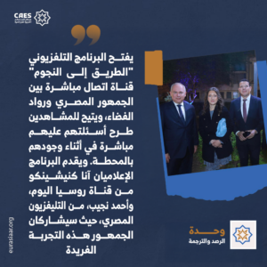يشكّل برنامج “الطريق إلى النجوم” نقلة نوعية في المشهد الإعلامي العربي، حيث يُتيح للمرة الأولى على الإطلاق للجمهور المصري والعربي فرصة فريدة للتواصل المباشر والحي مع رائد فضاء روسي أليكسي زوبريتسكي في أثناء وجوده في رحلته الفضائية على متن محطة الفضاء الدولية (ISS)؛ ما يخلق جسرًا إعلاميًّا وعلميًّا غير مسبوق بين الأرض والفضاء.