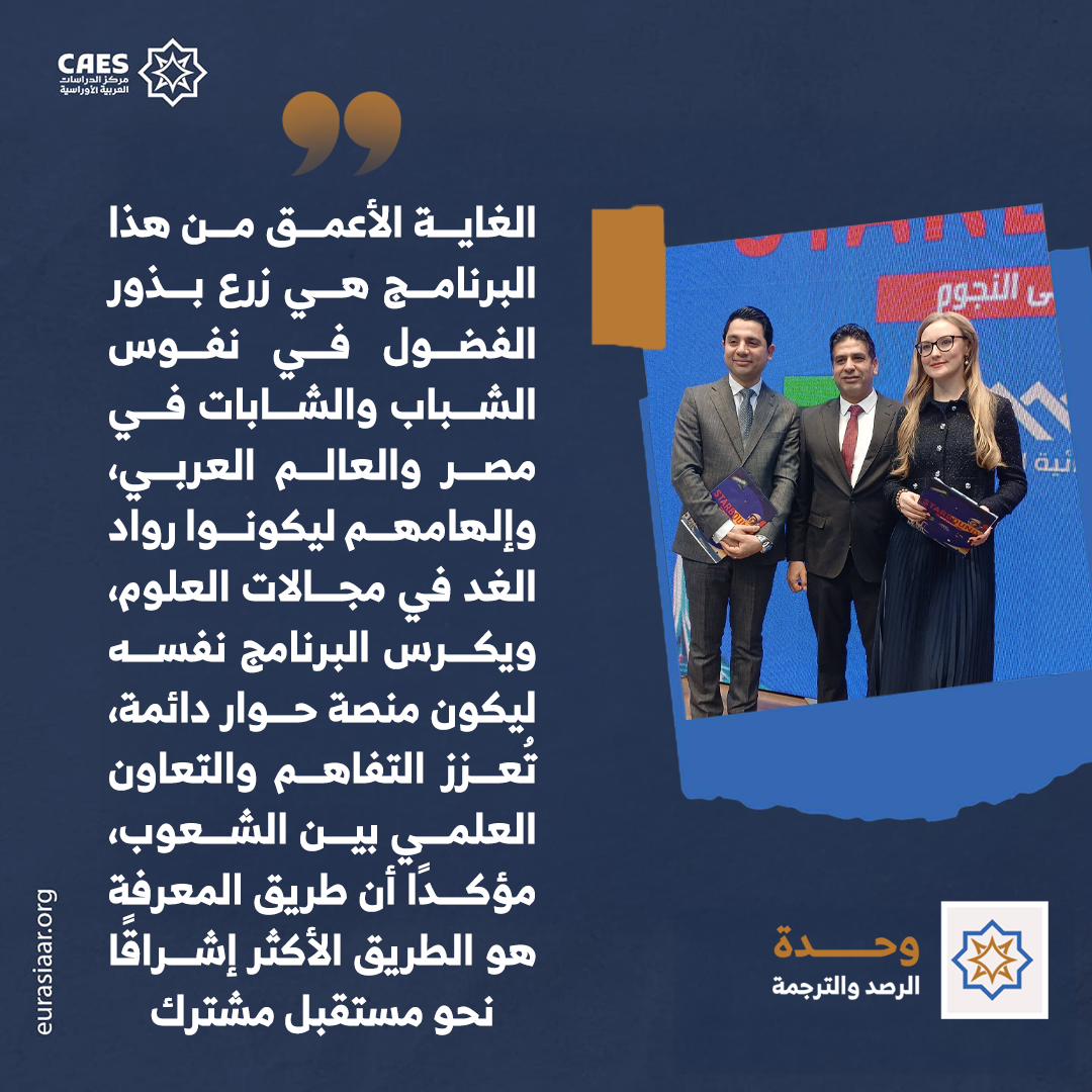 إن برنامج “الطريق إلى النجوم” أكثر من مجرد سلسلة تليفزيونية، بل إن الغاية الأعمق من هذا البرنامج هي زرع بذور الفضول في نفوس الشباب والشابات في مصر والعالم العربي، وإلهامهم ليكونوا رواد الغد في مجالات العلوم، ويكرس البرنامج نفسه ليكون منصة حوار دائمة، تُعزز التفاهم والتعاون العلمي بين الشعوب، مؤكدًا أن طريق المعرفة هو الطريق الأكثر إشراقًا نحو مستقبل مشترك.