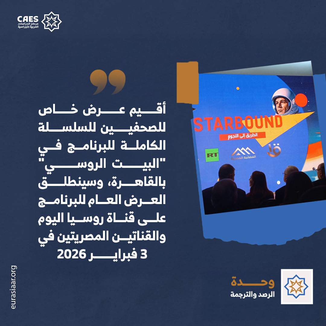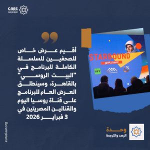 وقد أقيم أمس عرض خاص للصحفيين على السلسلة الكاملة للبرنامج في “البيت الروسي” بالقاهرة، وسينطلق العرض العام للبرنامج على قناة روسيا اليوم والقناتين المصريتين في 3 فبراير (شباط) 2026.