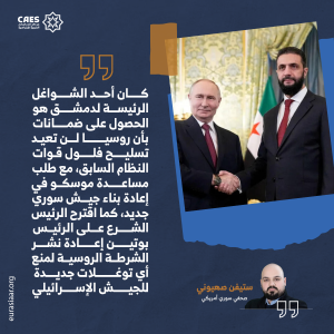 وصف الخبراء الروس المحادثات الرفيعة المستوى مع الرئيس الروسي فلاديمير بوتين وكبار المسؤولين الآخرين بأنها “براغماتية”، وشملت مجموعة شاملة من القضايا، منها الضمانات الأمنية، والتعاون العسكري، والدعم الاقتصادي، ومستقبل القواعد العسكرية الروسية في سوريا.