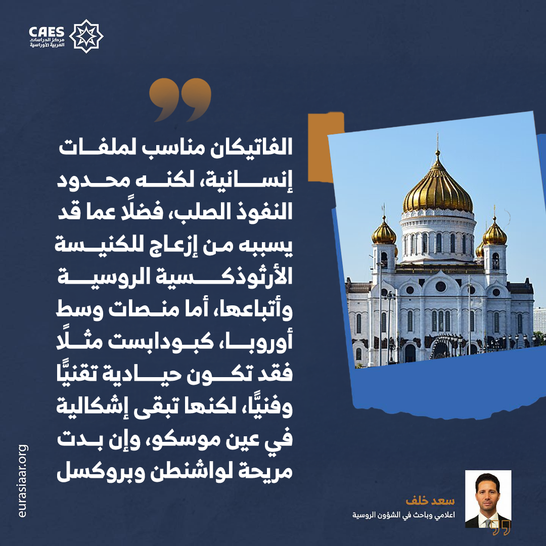 الفاتيكان مناسب لملفات إنسانية، لكنه محدود النفوذ الصلب، فضلًا عما قد يسببه من إزعاج -إذا وقع عليه الاختيار- للكنيسة الأرثوذكسية الروسية وأتباعها بسب الخلفية الدينية؛ ولذلك أستبعد أن يقبل به بوتين.