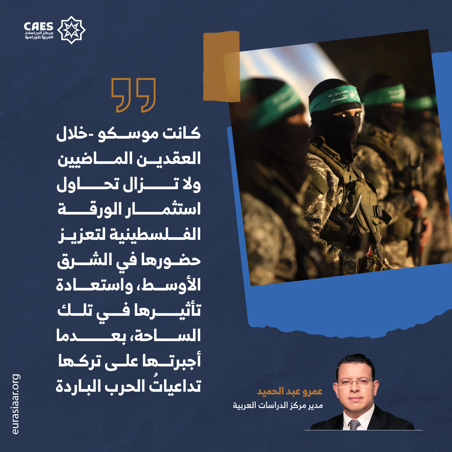 كان واضحًا أن سعي موسكو إلى استثمار الورقة الفلسطينية هو ما دفعها إلى تلك الخطوة؛ لتعزيز حضورها في الشرق الأوسط، واستعادة تأثيرها في تلك الساحة، بعدما أجبرتها على تركها تداعياتُ الحرب الباردة، فيما بدا أن أطرافًا عدة وجدت في علاقة موسكو وحماس فرصة لإنشاء قناة بديلة أو موازية للتواصل مع الحركة التي فرضت نفسها بقوة على المشهد.